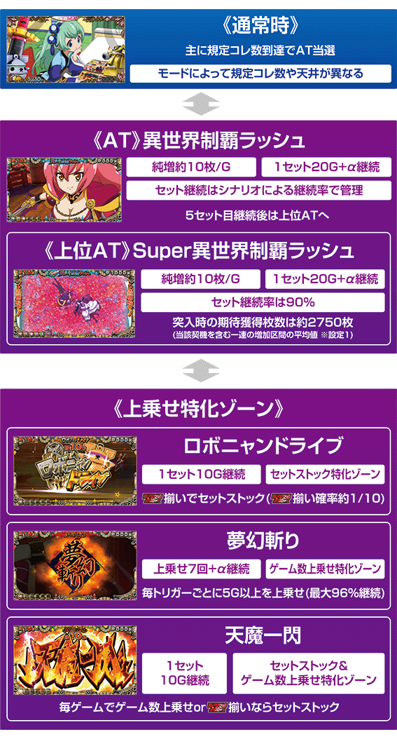 通常時はモードA・B・C・天国・裏天国・極楽のいずれかに滞在。モードによって規定コレポイント到達期待度の高いゾーンや天井が異なり、天国以上なら128コレ以内の規定コレポイント到達となる。