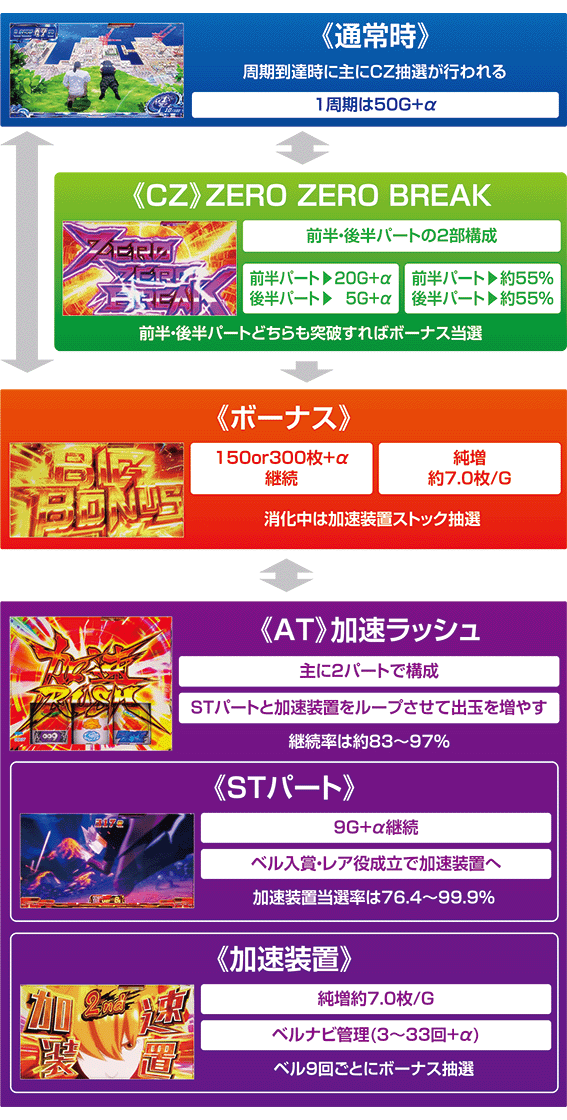 STパートは9G+α継続し、消化中にベル入賞orレア役成立で加速装置に当選(加速装置終了後は再びゲーム数を9GにセットしてSTパートへ)。ステージレベルによってベルのナビ発生率が変化し、9G消化後も加速装置当選までSTパートが継続することもアリ。