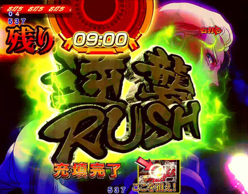 滞在中は電サポ7回転で抽選が行われ、図柄揃いでVアタッカーが開放し、V入賞すれば大当り。大当り後は再び「逆襲RUSH」へ突入する仕様で、電サポ7回転の継続率 約62.6%。