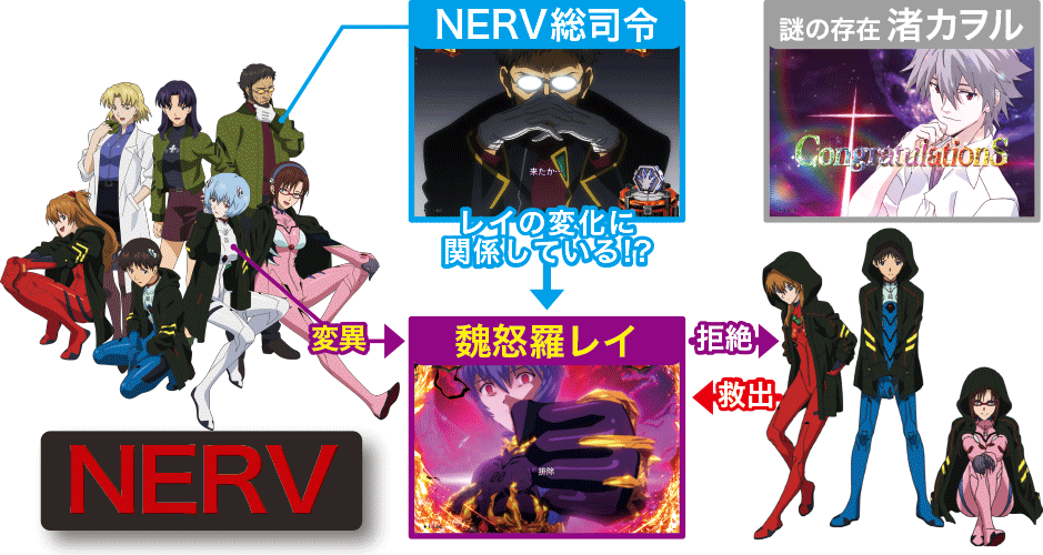 演出が継続して3段階目(赤エフェクト)まで発展したり、登場キャラがレイだとチャンス。 | 最終段階まで発展すれば暴走当りが発生⁉ |