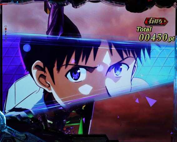 リーチ中盤のボタンPUSH演出でシンジがカットインするルートはデフォルトパターンとなる。 | ボタンPUSHでミサトがカットインした場合はミサトルートとなり信頼度が大きく上昇! |