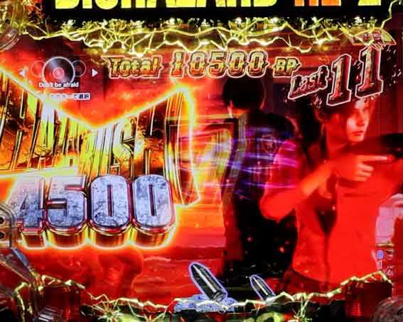 ゾンビとの押し合いを制すれば大当りとなる。 | 武器の実体化に成功後、デバイス操作で図柄が揃えば大当り! |