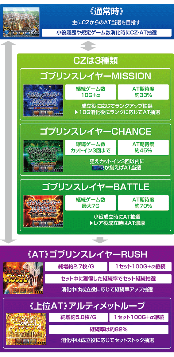 PREMIUMゴブリンスレイヤーRUSH当選時は継続濃厚のATに突入し、内部的に裏ストック抽選が行われる。また、1/8で上位ATへ移行する可能性があるため、大いに期待できるトリガーとなっている。