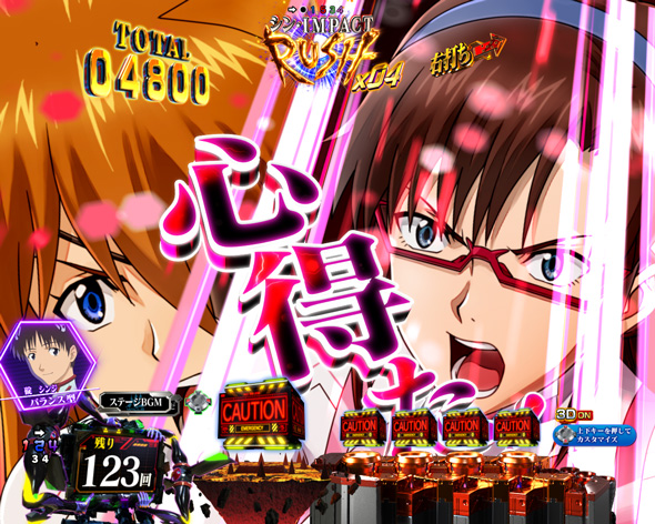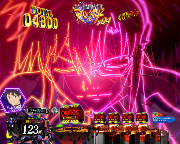 | 初当り(全回転・135図柄揃い・奇数図柄揃い・偶数図柄揃いの一部)後やチャンスタイムタイム中の大当り後に突入するモード。 ST中は5種類のパイロット(演出モード)から選択可能。 ■碇シンジ ■式波・アスカ・ラングレー ■アヤナミレイ(仮称) ■渚カヲル ■真希波・マリ・イラストリアス 残り回数に応じて背景と演出バランスが変化する。 シン・IMPACT RUSHの継続期待度は約81%。 |