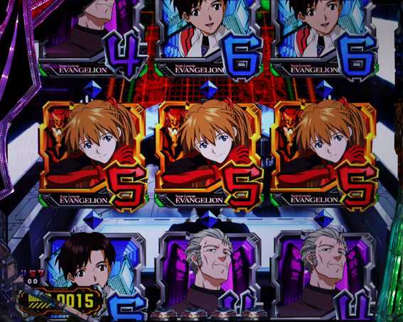バラケ目停止後に、シンジ・アスカ・レイの3人が出撃に備える特殊発展演出は、発展成功で信頼度大幅アップ⁉ |