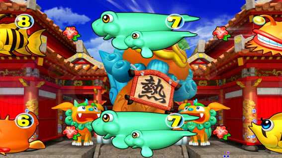 発生時点でアツいリーチ。ワリンの後ろのモーターがいつもより大きいとチャンスだ。 | シーサーが吠えて図柄を停止させる高信頼度リーチ。シーサーが「熱」の前掛け付きだとチャンスアップ。 |