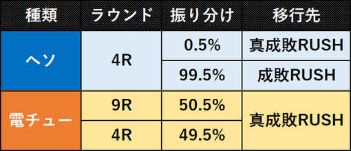 滞在中の大当り後は再び「真成敗RUSH」へ突入する仕様で、継続率は約70%。また、右打ち中の大当り時は50.5%が約990発獲得可能な9R大当りとなる。