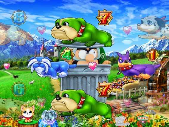 シングルラインのSPリーチ。犬吉が隠れるゴミ箱がステッカー付きだとチャンスアップ。 | シングルラインから発展。背景を鳥が飛んでいるとチャンスとなる。 |