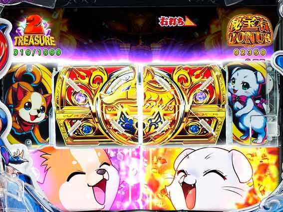秘宝石ギミックが完成すればRUSH継続となるシンプルかつアツくなれる演出が展開。ギミックの動きやチワワ&スコティッシュフォールドのアクションなどで信頼度が変わる。 |